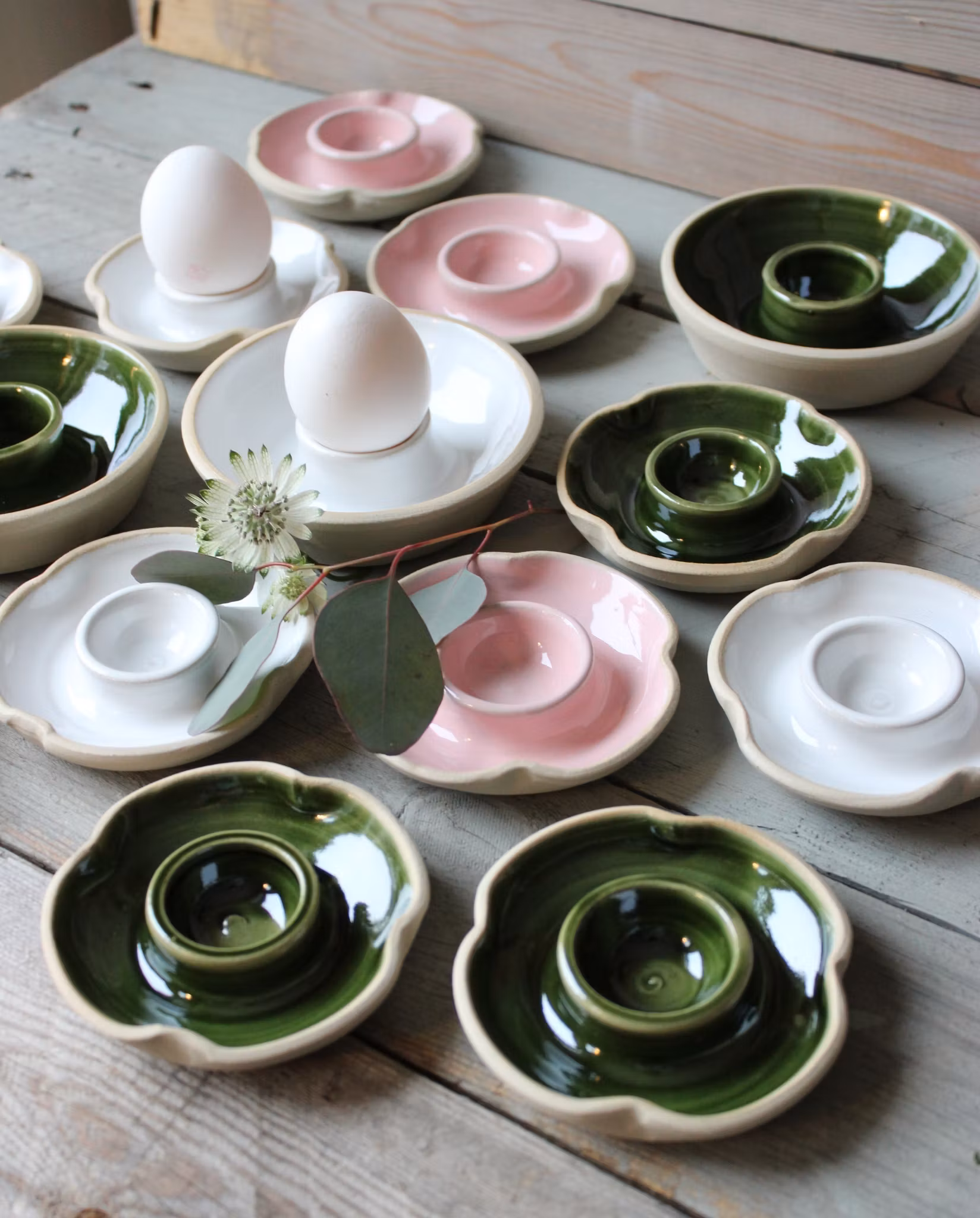 Hand made ceramic eggcup. White, pink or forestgreen glace.