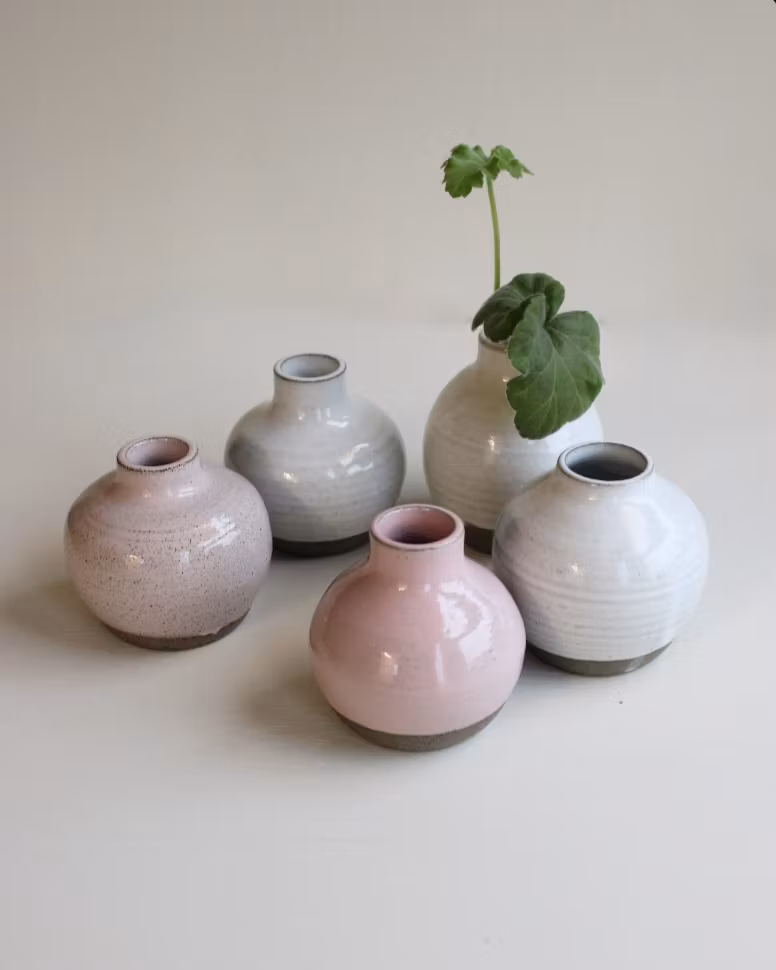 Alla vaserna är unika och olika. Någon lite lägre och bredare, någon smalare med lite längre hals. Finns i tre olika utföranden, VIT, LJUSROSA och HIMMELSBLÅ. Välj glasyr i menyn. Höjd ca 9 cm. Tål maskindisk.