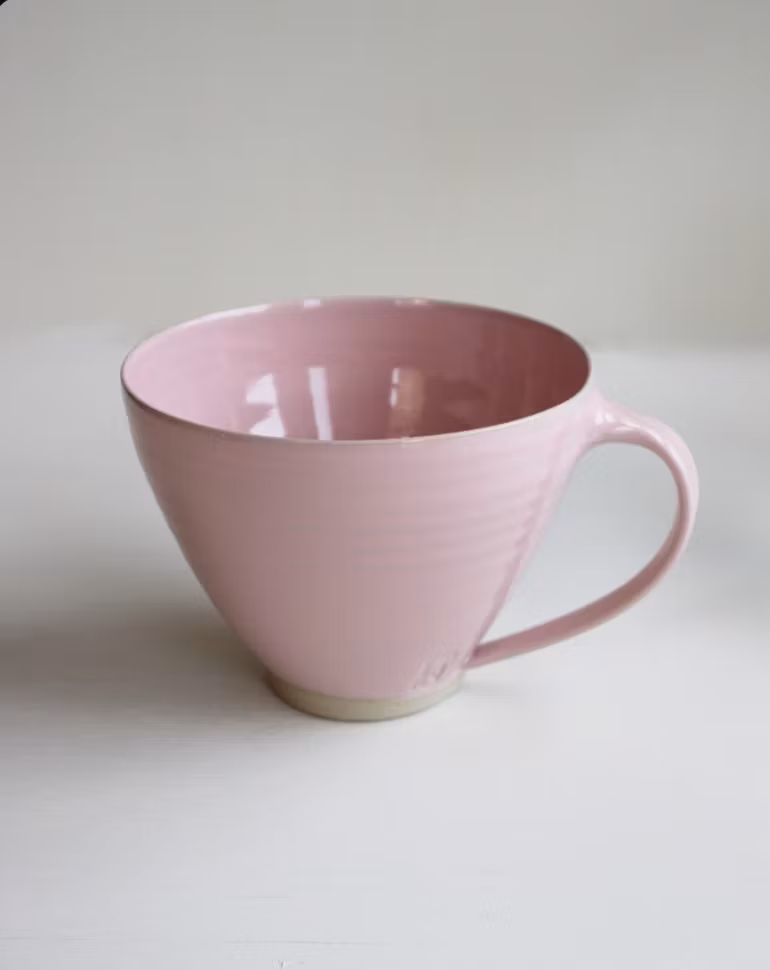 Stor handdrejad tekopp i stengodslera med hänkel. Ljust rosa glasyr.